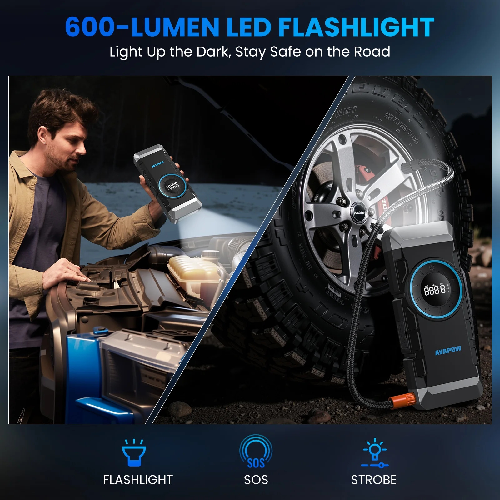 • Versatile Functions: Functions as an automobile battery charger, emergency starter, air compressor, 600 LUMENS LED camping light, emergency SOS tool, and portable mobile power source.
