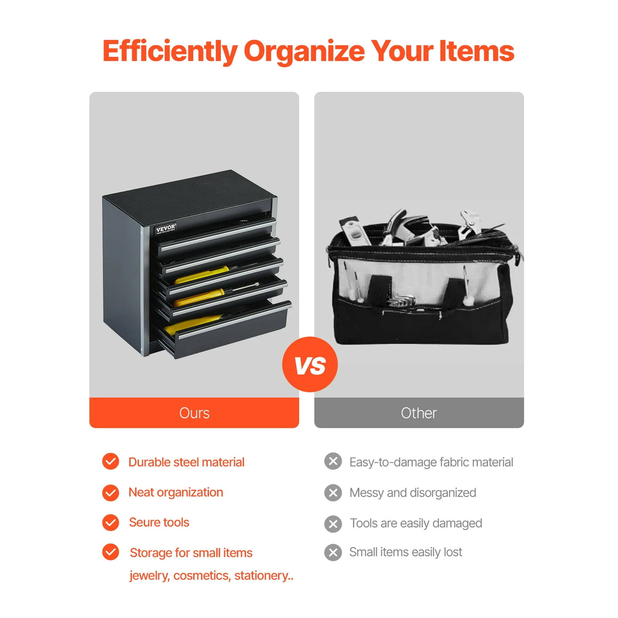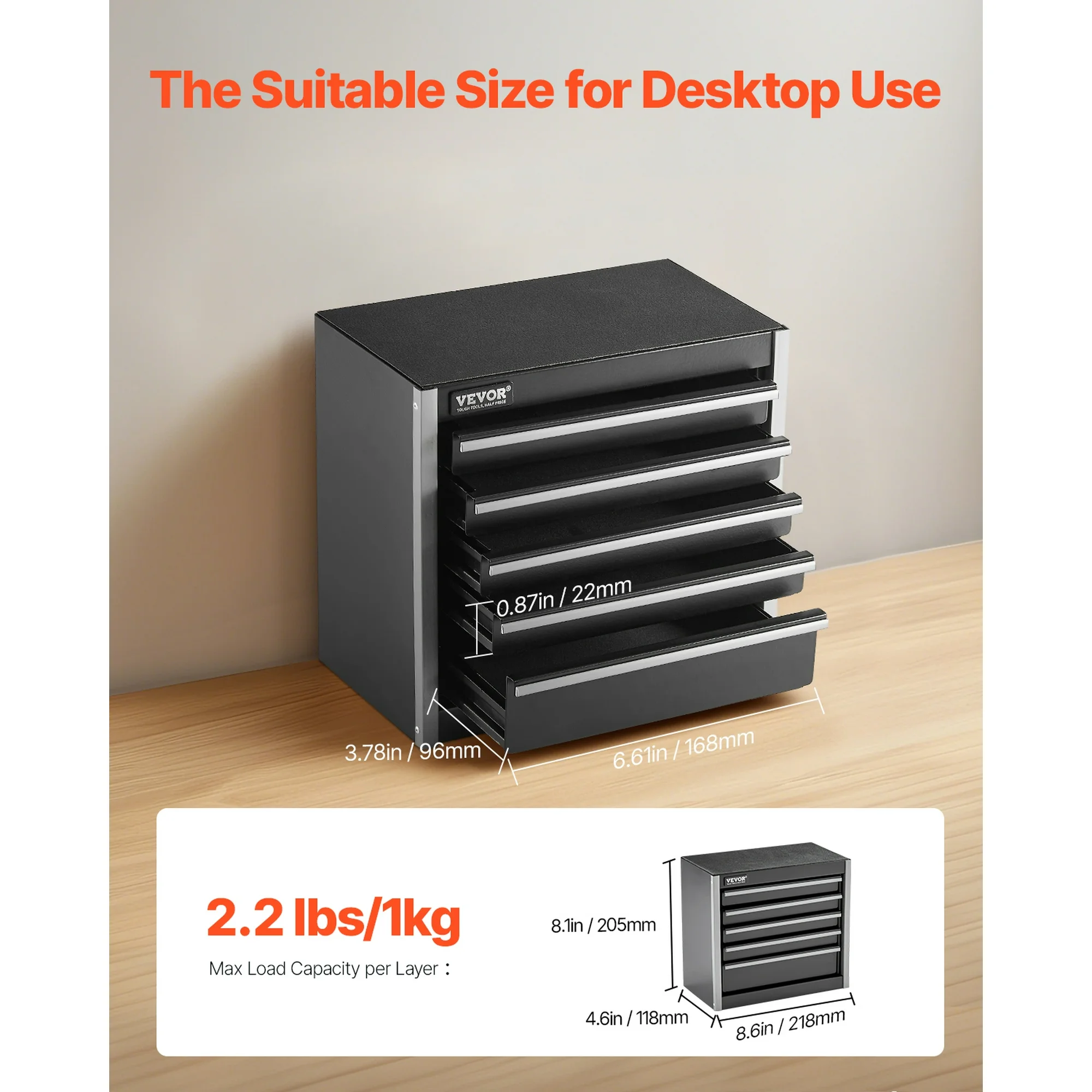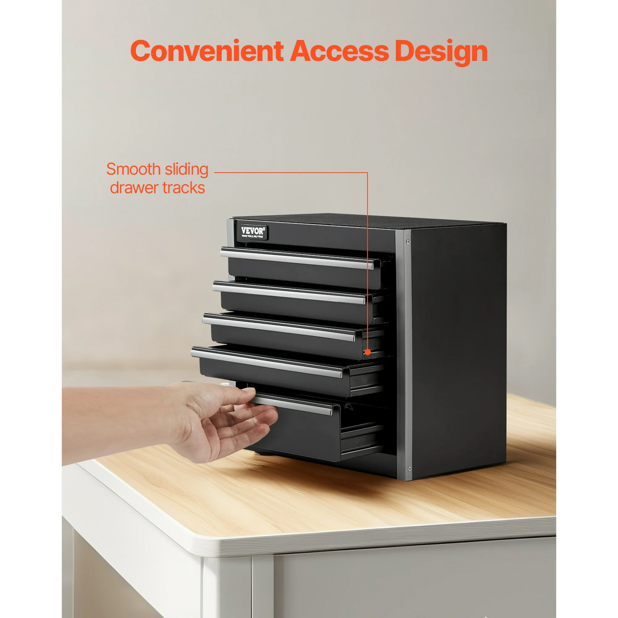 VEVOR Metal Tool Box, 8.6-inch, Portable Metal Tool Box with 5 Drawers, Small Tool Chest with EVA Liners and PP Feet Pads, Heavy-Duty Steel With Ball Bearing Opening and Powder Coated Finish, Black